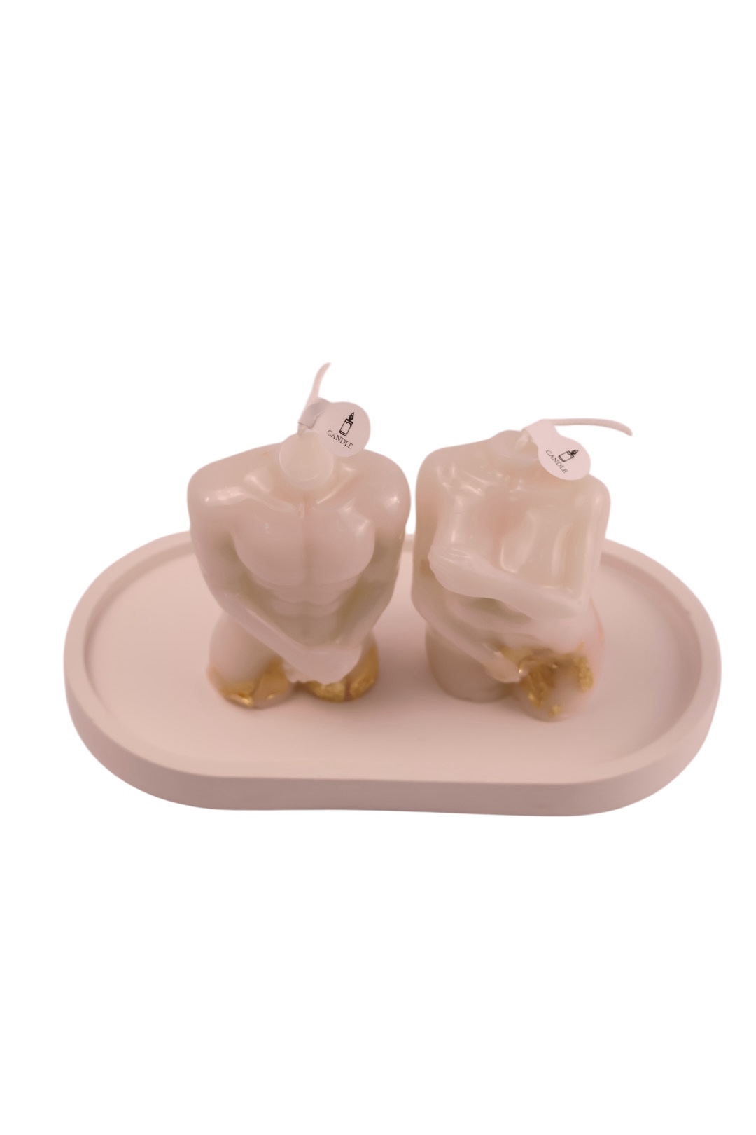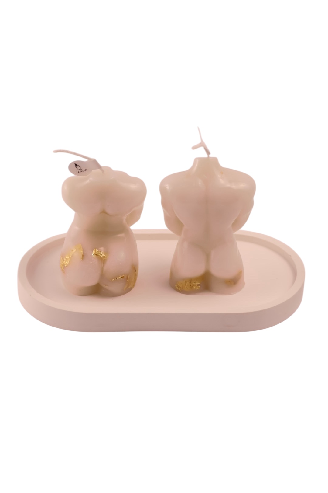This set includes two handmade scented candles shaped as a beautiful male and female body. The candles are made from white beeswax, which burns cleanly without toxic substances and gives off a subtle natural honey scent. The pearl finish and gold base make them a stylish and elegant accent for any home. This set is the perfect gift for a special someone or for creating a cozy and romantic atmosphere at home.